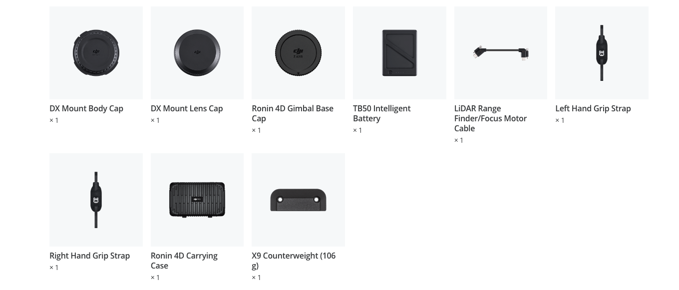 2. Measured with a fully charged TB50 Battery and Ronin 4D in a still state with the gimbal balanced, the Z-Axis inactive, and continuously recording in RAW. Gimbal movements or use of the Z-Axis will reduce operating time.
