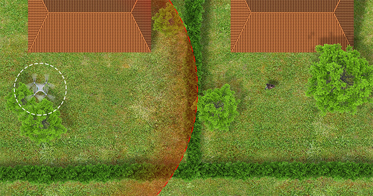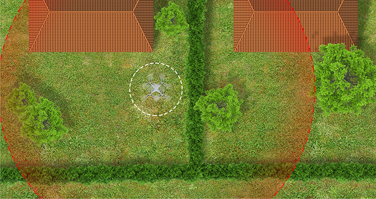 Hvis du flyver med en drone med en sikkerhedsafstand som A2 eksempelvis må du dog gerne flyve op til hegnet eller afgrænsnignen da du skal holde afstand til uvedkommende personer og ikke til ejendomme. Så du kan godt lægge din sikkerhedszone ind over hækken men husk at flytte den hvis der kommer nogen ud i haven. Ellers afbryd flyvningen.
